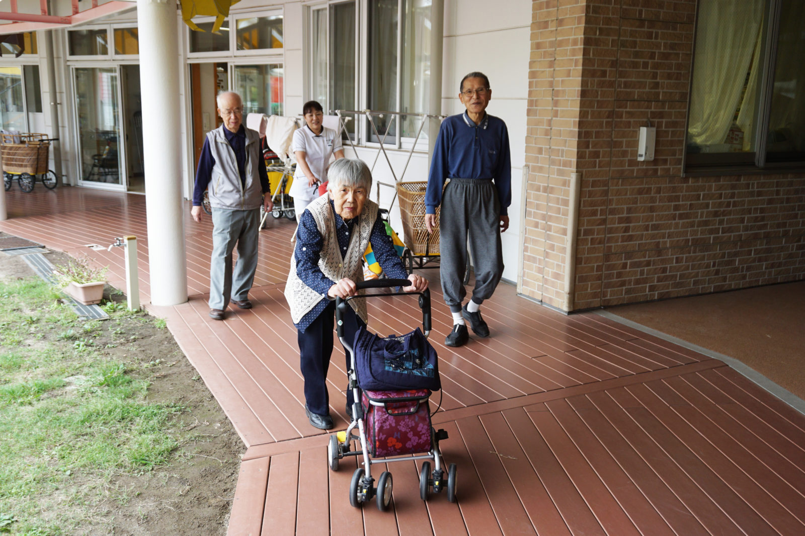 介護予防の一環で、機能訓練指導員立ち合いの基、こども園の園庭を使用し、歩行訓練を実施しています。又、集団体操も実施しており、ADLの機能低下防止に務めています。