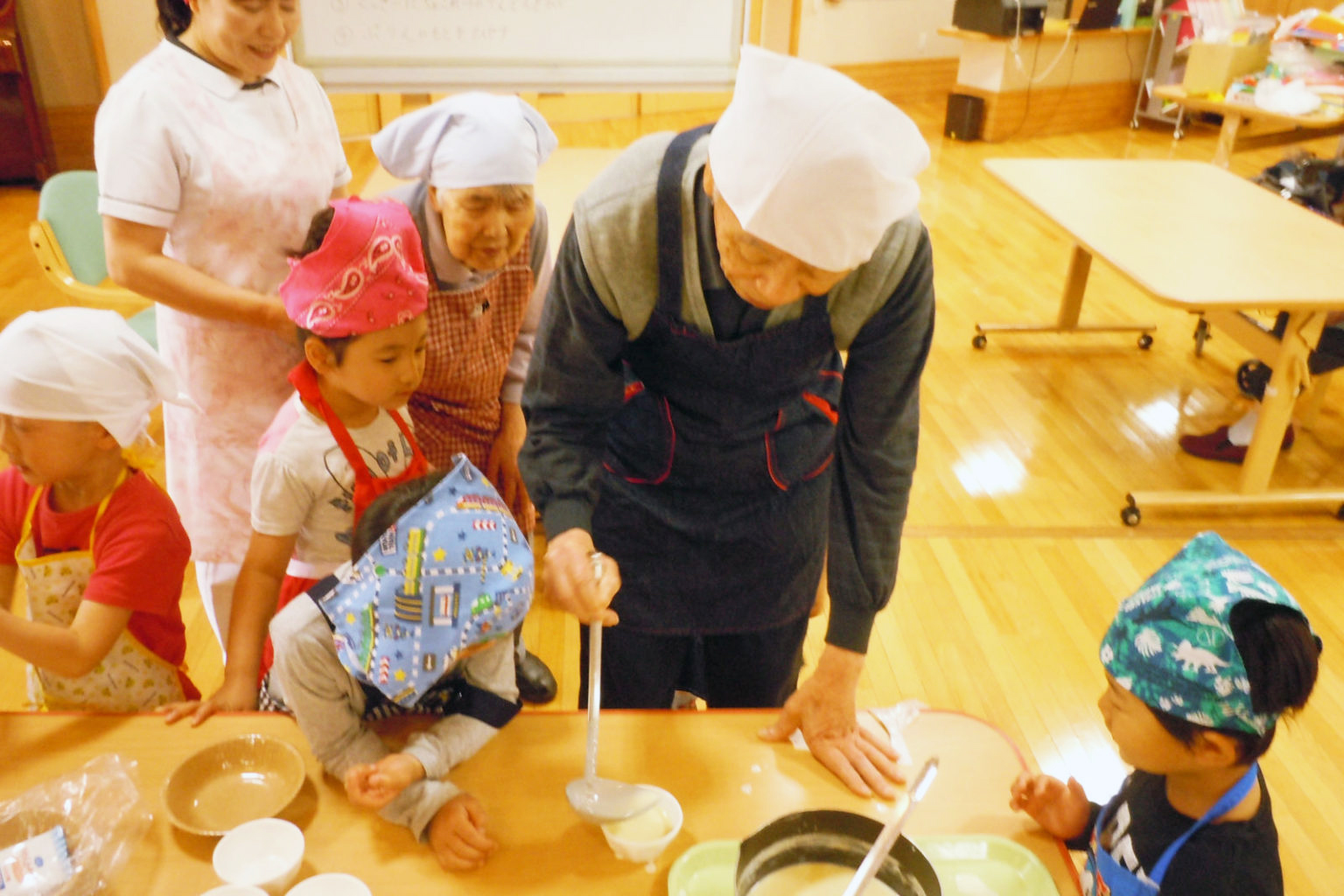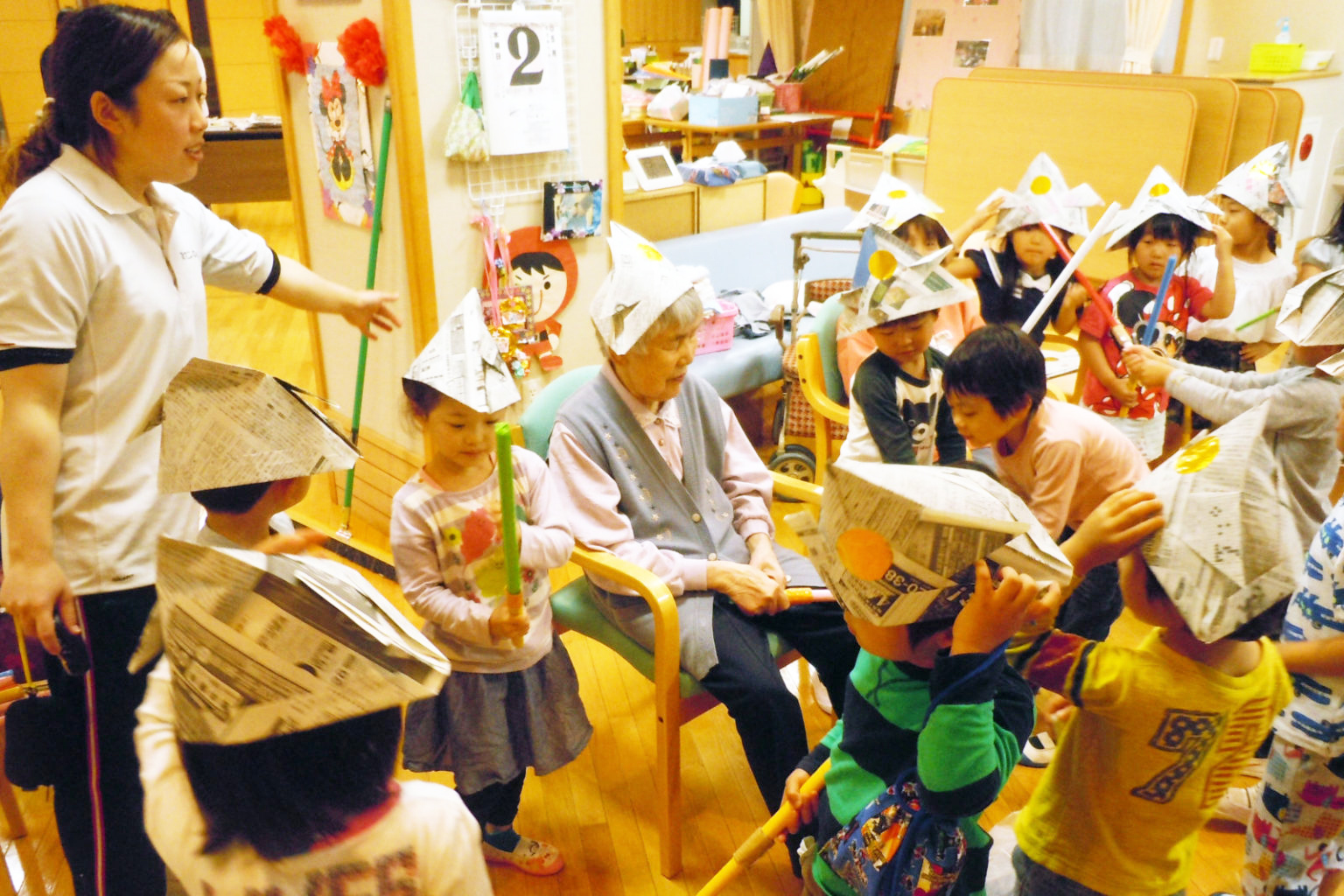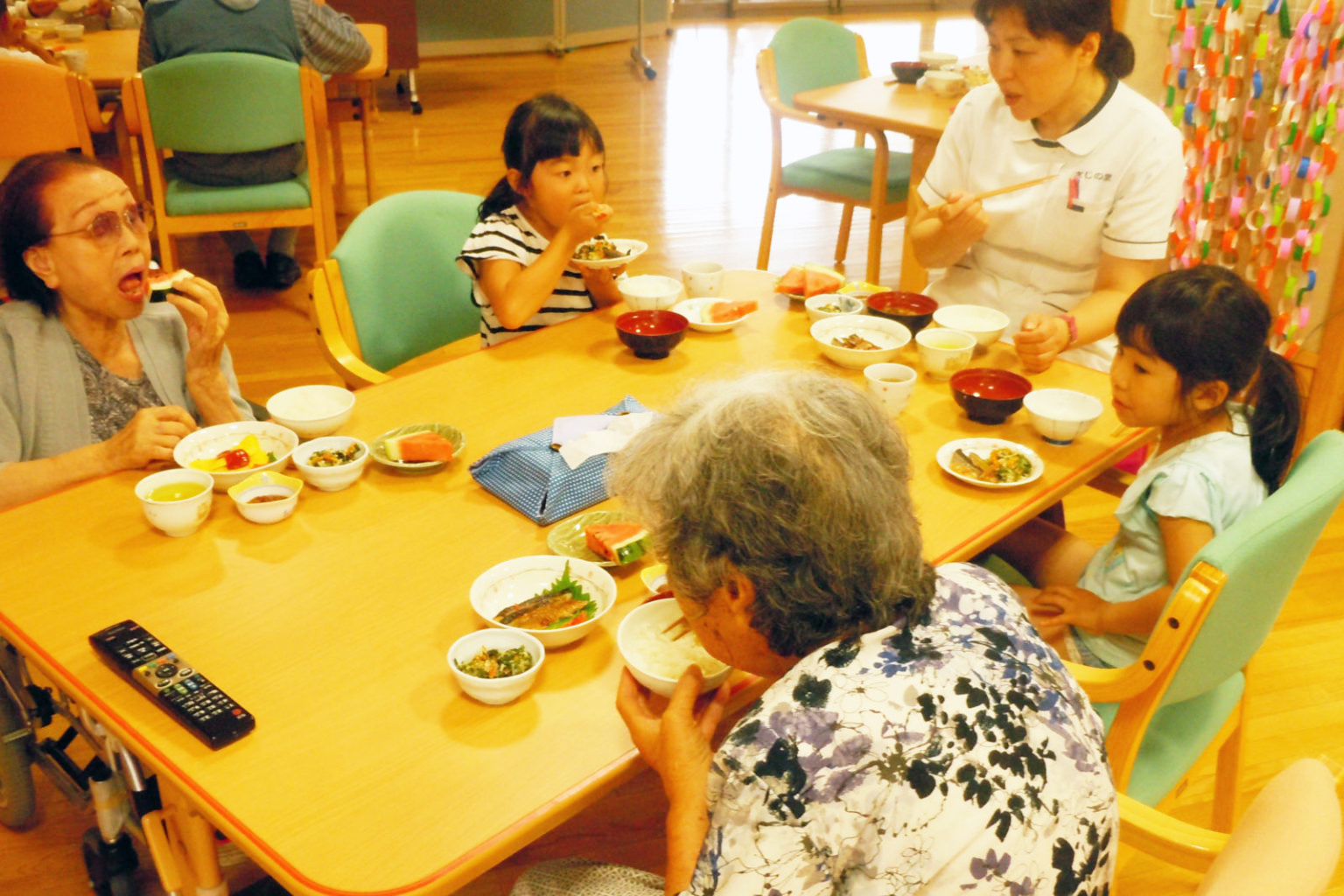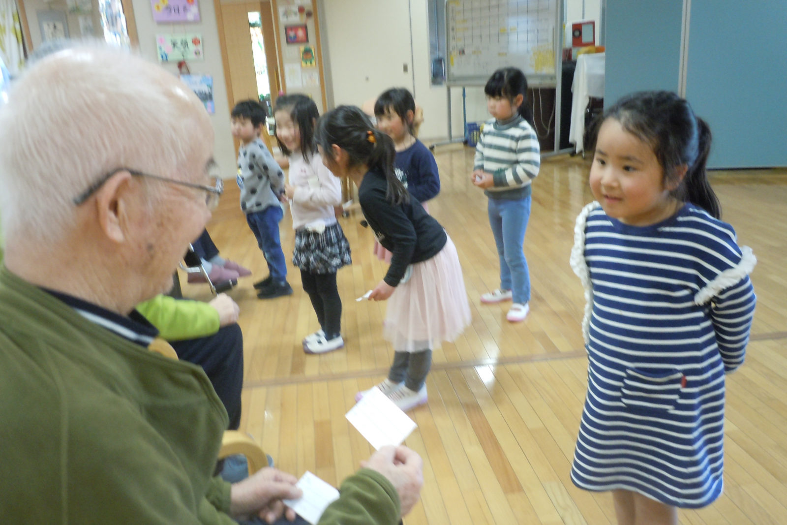 デイサービスの利用者とこども園の園児と交流をしています。ご利用者の皆様、園児の皆様共に始めは緊張されていましたが、会話が弾むにつれ、歌を唄ったり、握手をしたりと笑顔があふれる交流となっています。