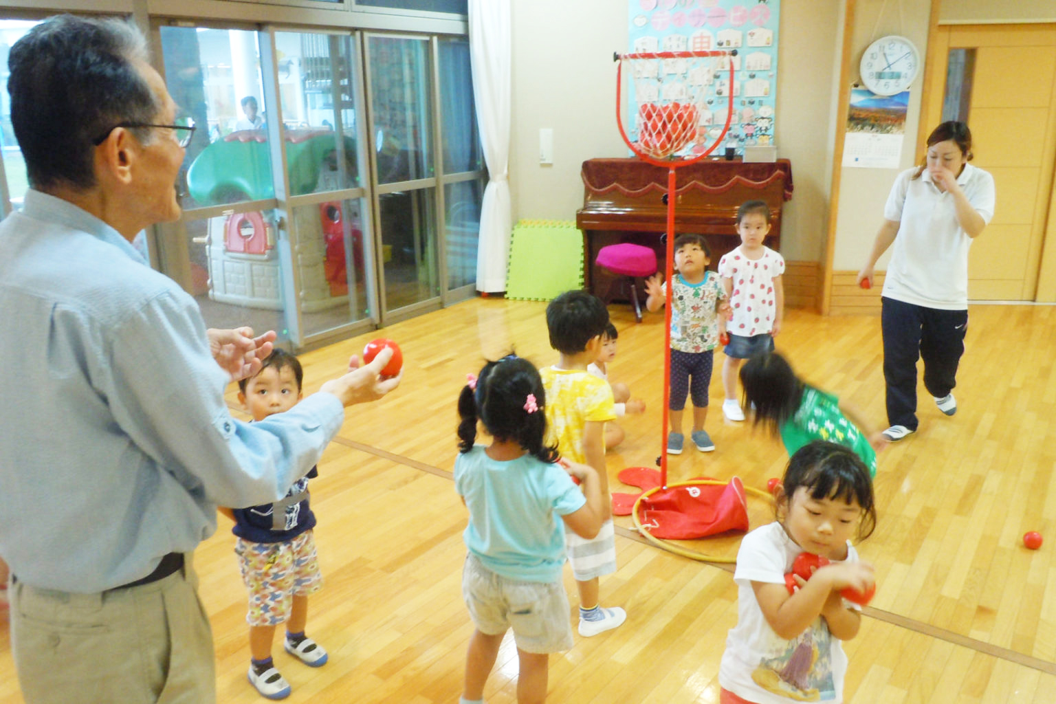 認定こども園がフロアーに隣接しており、園児の元気な姿を見ることも出来ます。こども園の園児と一緒に工作をしたり、色塗りをしたり、一緒に散歩したりなど、子どもと一緒に楽しみながら、手を動かしたり、体を動かすことが出来ます。